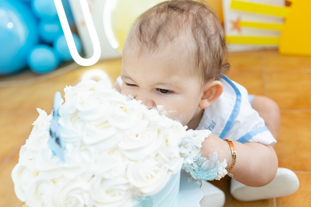A sessão pode ser feita com bolo, frutas, panquecas ou até pintura! Tem o principal objetivo de guardar a reação e a diversão do seu bebé no contato com novas texturas e sabores.